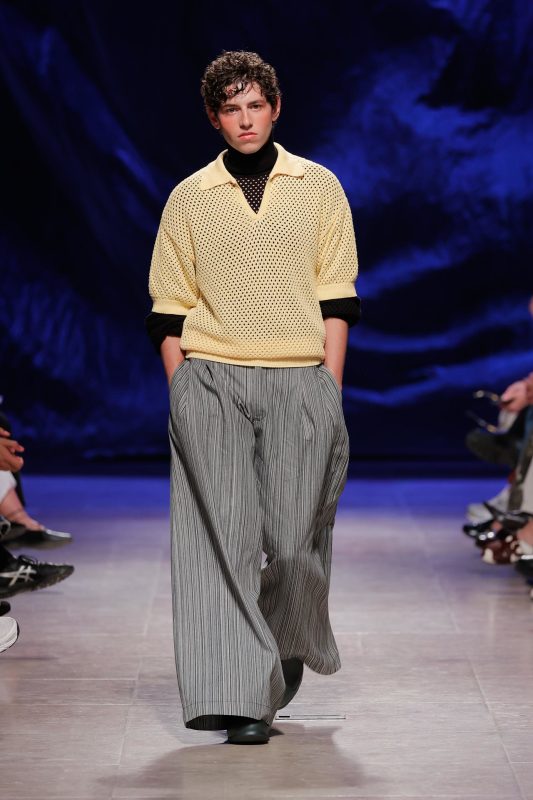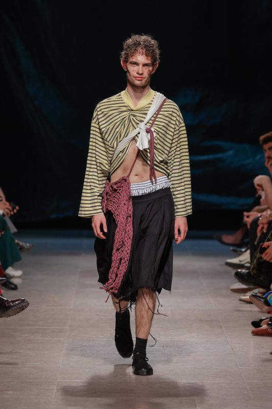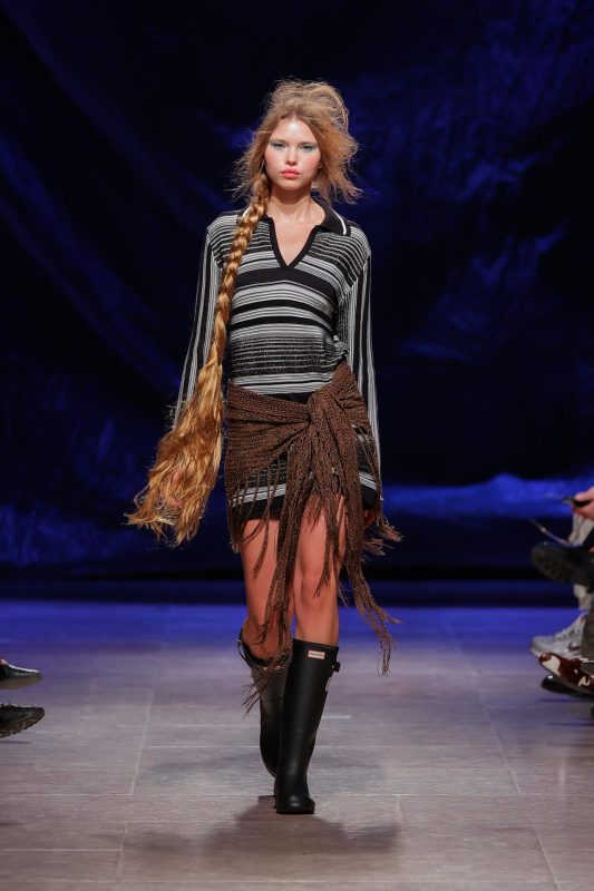 Part of ModaLisboa's Spring 2026 Workstation Design program for emerging talent, Atanásio's "Anarchy of Innocence" collection brings her signature grungy edge to the runways. Between the hiked-up striped tees and sweaters worn wrapped around the ribcage, most of the pieces remain wearable. Oversized knits are slashed, while frayed jeans were layered underneath baggy shorts; both had been carefully distressed to feign constant wear and tear. This disheveled-ness extended to the styling, too, with models walking the runway with dirt on their face and the clothing strewn across the body.