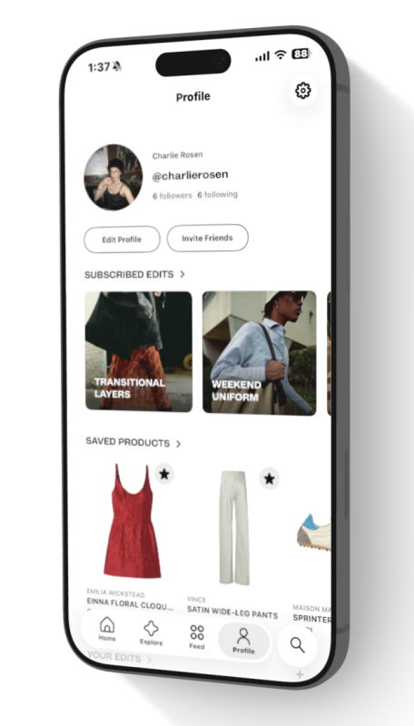 Upon downloading the app, users select their style, follow celebrity accounts and get personalized feeds with product recommendations. (Some VIP names that already have verified profiles include Emma Roberts, Emma Chamberlain, Winnie Harlow and Quavo.) Consumers can also build out their own curated edits.