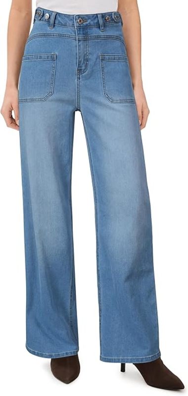 These high waisted jeans are designed with adjustable buttons, trendy front pockets and a flattering wide-leg cut. Stretchy denim moves with you from work to city strolls.