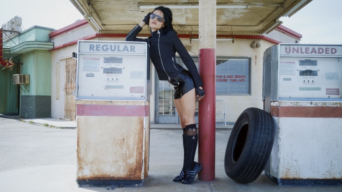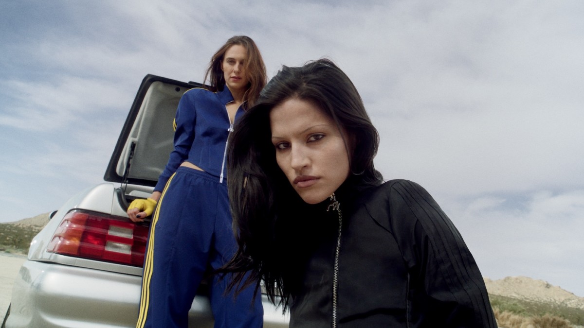 Since launching in 2016 and quickly achieving Instagram virality, Miaou has remained a go-to for "It" girls, especially those of the West Coast variety — ladies like, say, Devon Lee Carlson and Gabbriette, who happen to star in the campaign for the label's inaugural collaboration with Adidas Originals, launching Tuesday. In images that could almost be outtakes from a Charli XCX music video, the internet-famous muses are seen wearing the motorsport-inspired collection while traversing the California desert in a convertible.