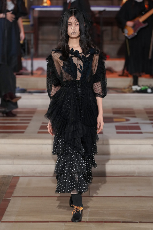 And the presentation of the collection was certainly emotional: As models in various shades of white, frilly gowns with tulle sleeves and lace hems circled the venue, a band of seven women (dressed in all-black interpretations of the runway looks) played light guitar, accompanied by harmonized vocals that sounded almost hopeful in melody. But soon after the first handful of looks came and went, the collection eased into a darker palette, representing the afterlife. As the sartorial transition took place, the singers began whispering repeatedly, "We can't help you."