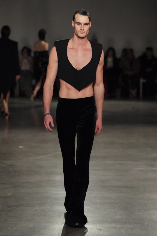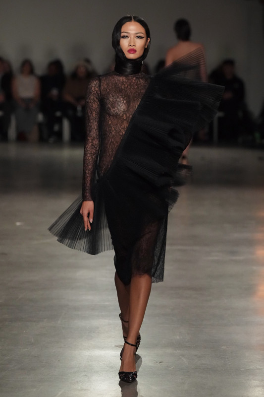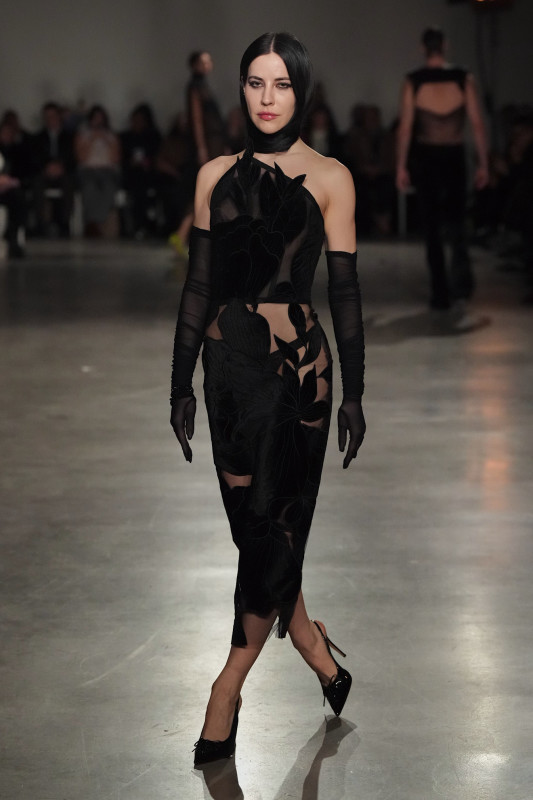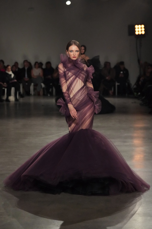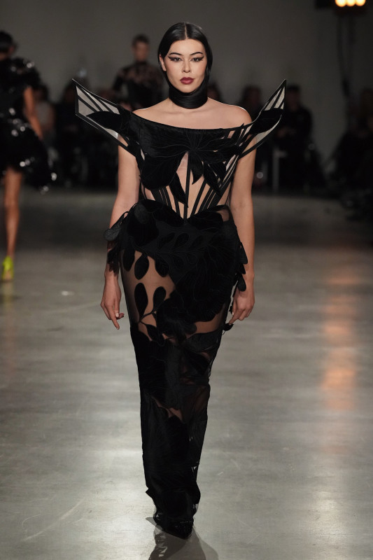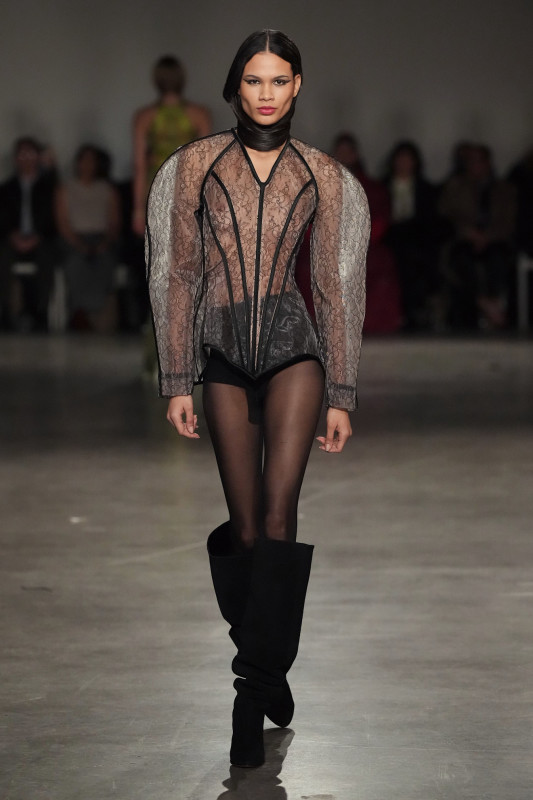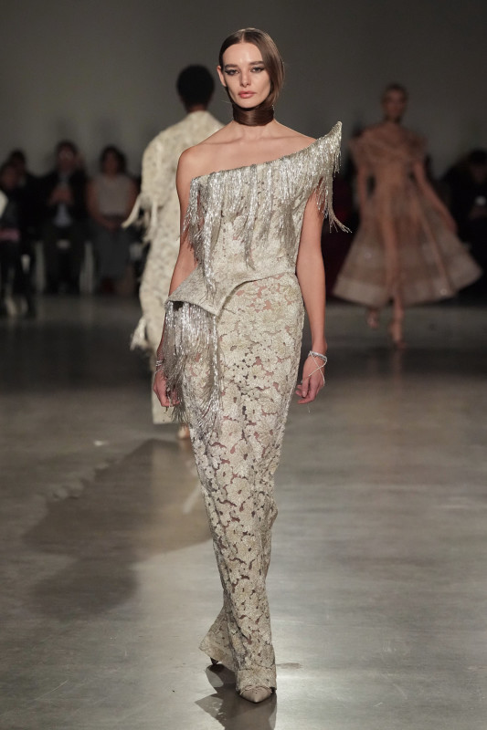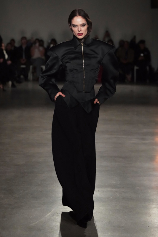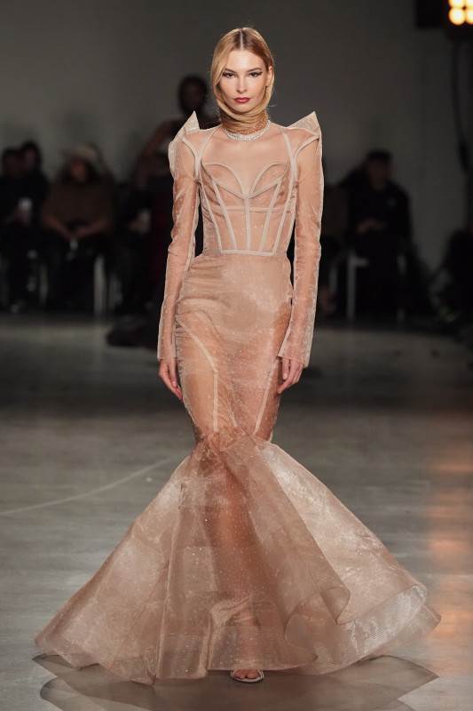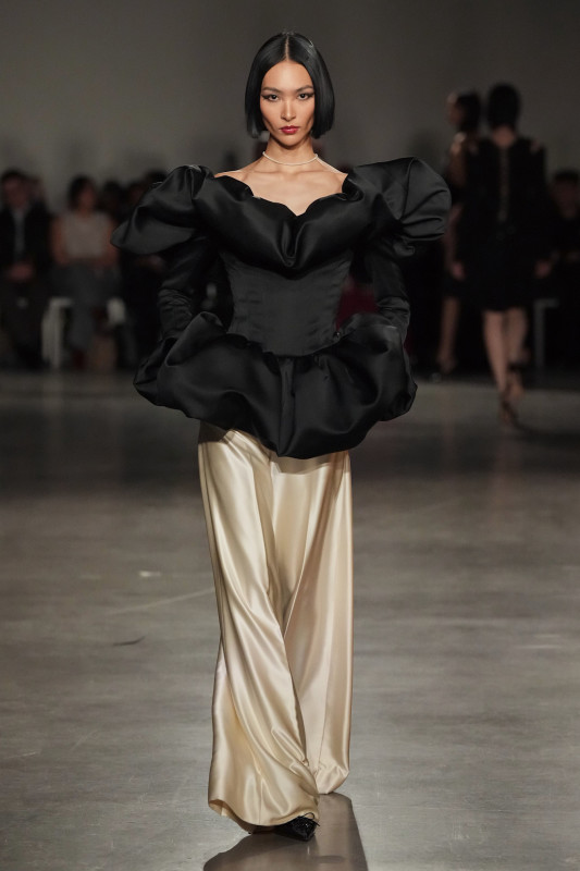 As usual, the brand's eveningwear lineup offers the most glamour and drama, such as the runway show's closing lineup of voluminous gowns. But it also offers glitz in the form of sculpted sequin dresses; sensuality in the array of sheer corsetry; and edge in the opening looks of all-black suits.