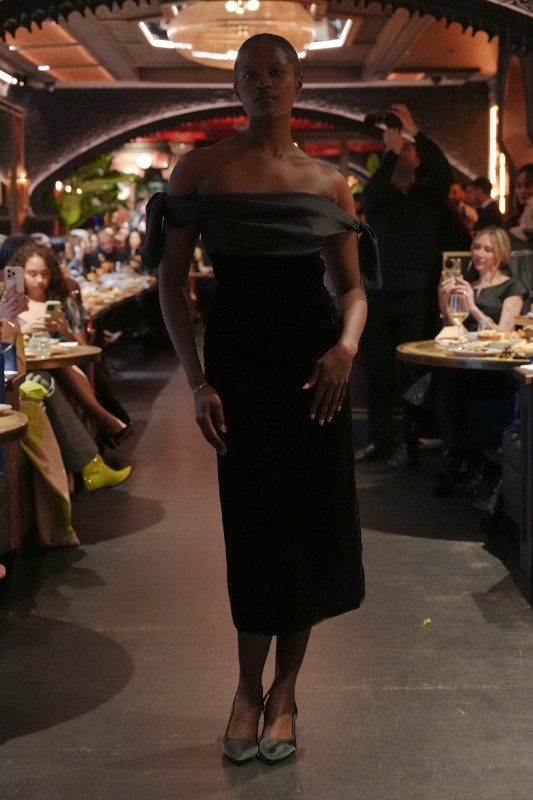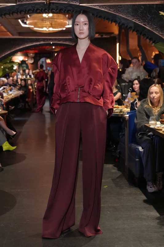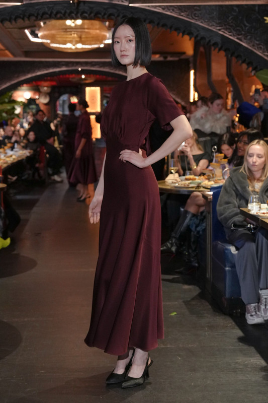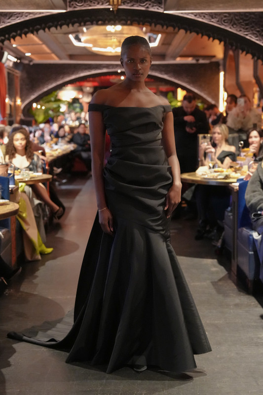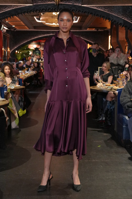 For Fall 2026, the designer took an unexpected pivot. Instead of another collection filled with dramatic, high-glamour pieces, he opted for simplicity. "With everything going on in the industry, I wanted to focus on the foundation," he told Fashionista after the show. A color palette of black, dark purple and wine red informed the lineup. He kept the silhouettes easy and streamlined: floor-grazing slip skirts, high-low blouses and various little black dresses.