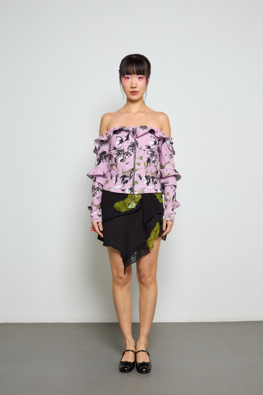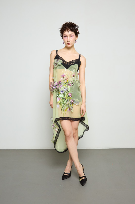 Aside from the more wearable, everyday looks in this collection, Zimbalist still wowed her attendees with a selection of sculpted ensembles. A black bioplastic bodice with a hand-painted floral motif flowing across the front acts as the centerpiece to a dark bridal outfit, a three-dimensional bouquet emerges from a mesh nightgown and the more flexible version of the biomaterial functions as piping around a tank top.