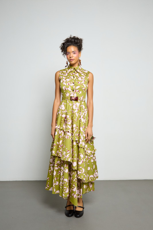 "The hero print of the season is a speckled flower, playing on the speckled vessels," she explained, pointing to poplin, Peter-Pan collared, asymmetric button-up blouses and silk maxi dresses. "Everything has been patterned and done. So, yes. These are all styles that could be bought. It's really happening."