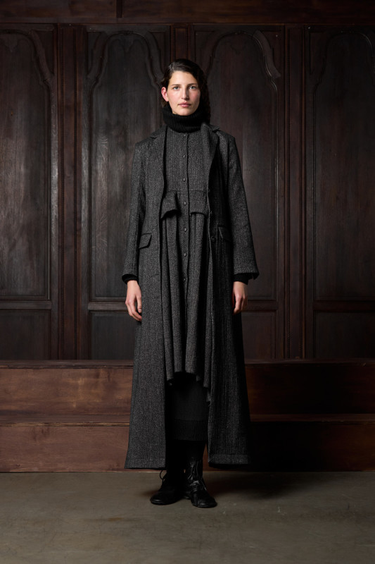 After the sun set on the first day of New York Fashion Week, Meruert Tolegen whisked showgoers away from the city's snow-covered sidewalks and welcomed them into a moody, cavernous abyss filled with sculptural styles. Live violinist Taisiya Losmakova flooded the label's SoHo flagship with serene music while statuesque models stood atop wooden platforms before periodically trading places, as if participating in a high-fashion chess match.