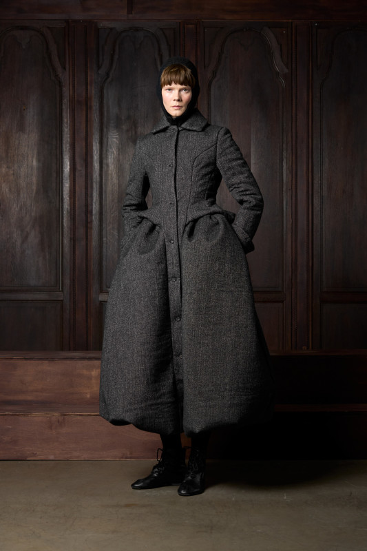 Tolegen's design signatures were on full display via exaggerated hip silhouettes, stiff corseted dresses and a subdued color palette. The designer often employs eye-catching fabrics and "quirky" uses of materials, with this season's collection spotlighting synthetic hair as its own fabrication.