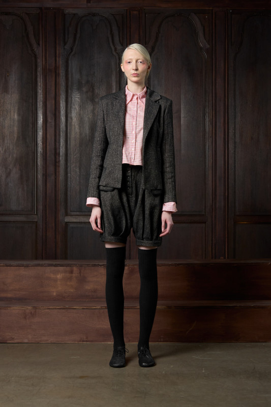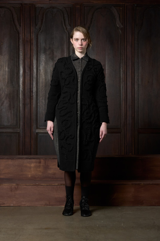 One of the Fall 2026 collection's standout garments is a cropped jacket completely made from synthetic hair that is basket woven at the front and hand-stitched down with braided hair lining the arms. The hair detailing also manifests as a statement collar on a structured column coat.