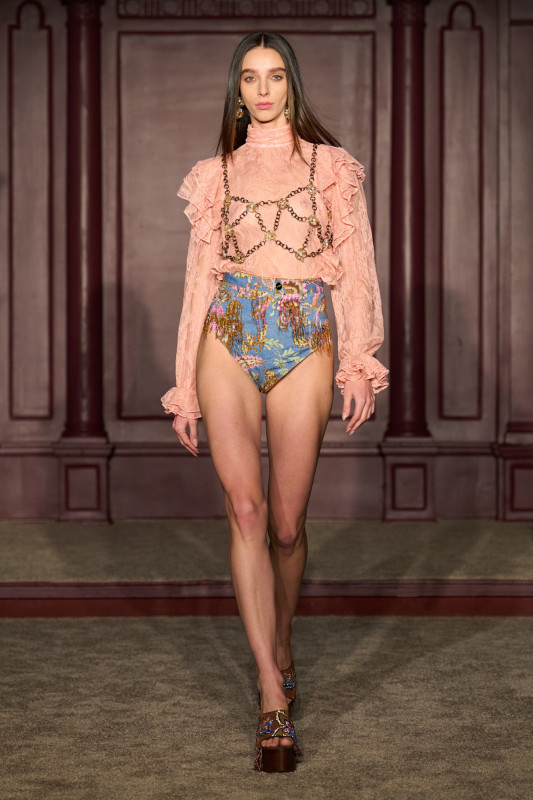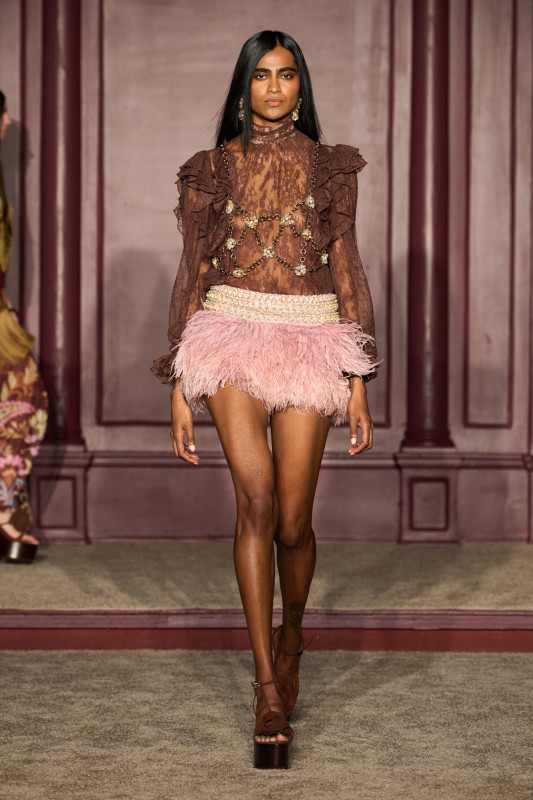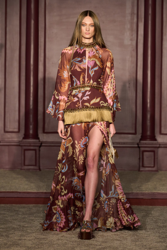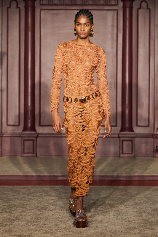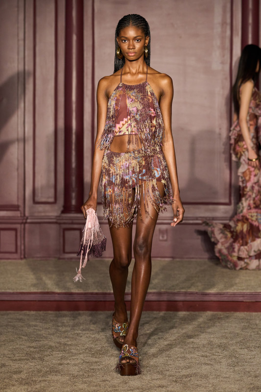 Bonaldi brought that "free-spirited" theme to life with a collection centered on movement, via floor-grazing maxi dresses, tops featuring bouncy, ruffled hems and flouncy, fringe-covered skirts. The collection also amps up the brand's penchant for glamor with lots of hand-embroidering and metallic finishes.