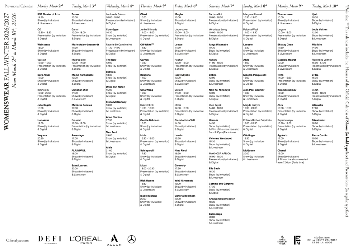 With New York Fashion Week just days away, Fashion Month planning has kicked into full gear and designers have locked in their runway slots. On Friday, the Fédération de la Haute Couture et de la Mode (FHCM), which organizes the events in Paris, released its preliminary Fall 2026 calendar, setting the stage for the end of the "Big Four" fashion week circuit.