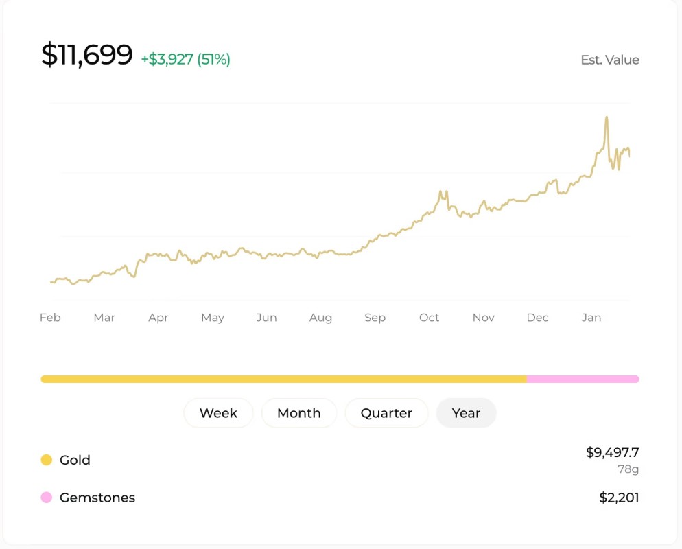"Say you used Unvault this January, you've already had a 20% increase on your jewelry portfolio," she adds, referencing the fluctuating gold market. Unvault isn't only pulling back the curtain on gold valuation, though; it assesses all precious metals and gemstones. Currently, the company tracks around $30 million worth of assets on its platform.